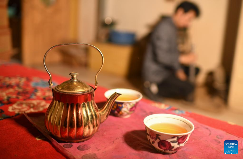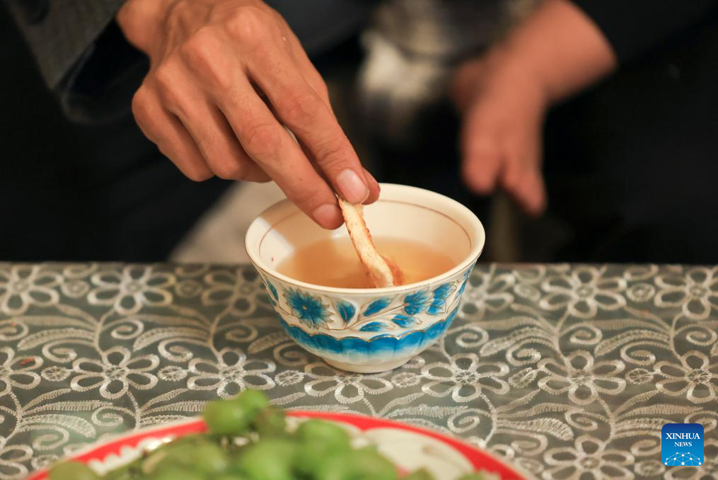 Metkasim Manglik dips a Naan into herbal tea at home in Qira County, northwest China's Xinjiang Uygur Autonomous Region, Sept. 5, 2025. (Xinhua/Wang Fei)