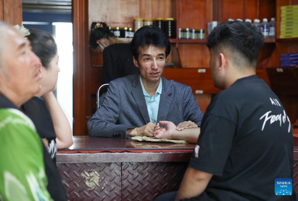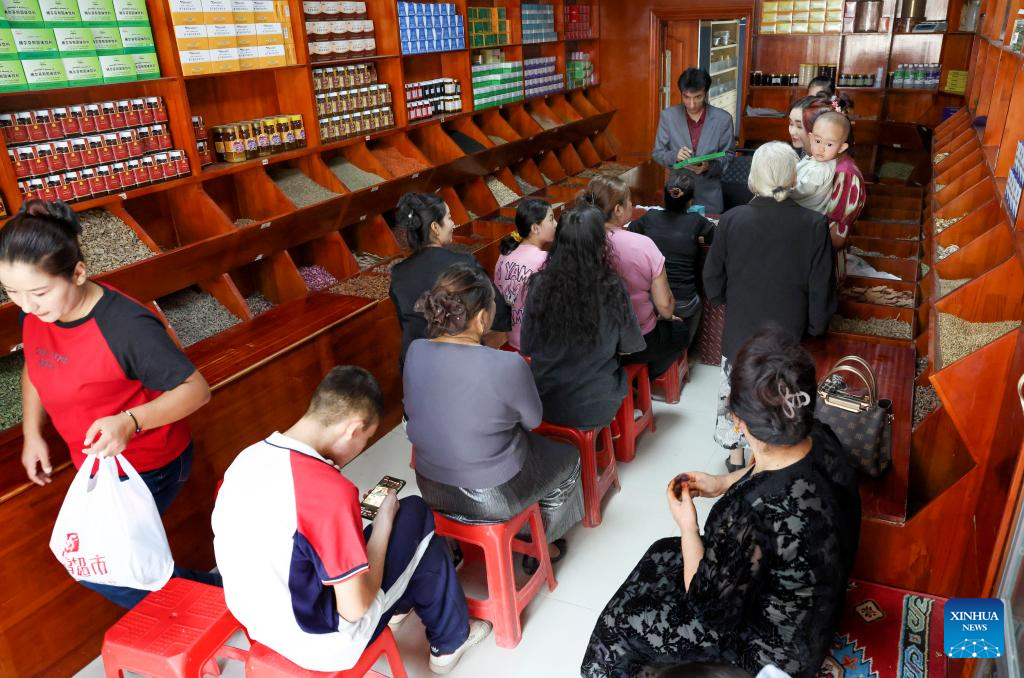 Metkasim Manglik (C) serves a customer at his herbal tea shop in Qira County, northwest China's Xinjiang Uygur Autonomous Region, Sept. 5, 2025. (Xinhua/Hu Huhu)