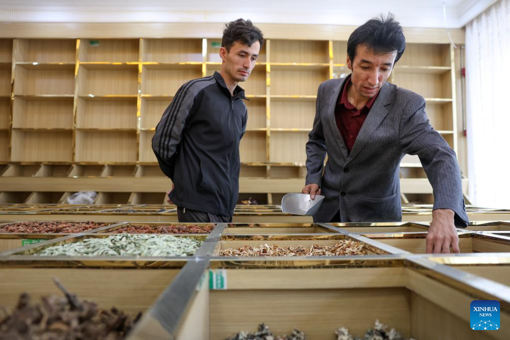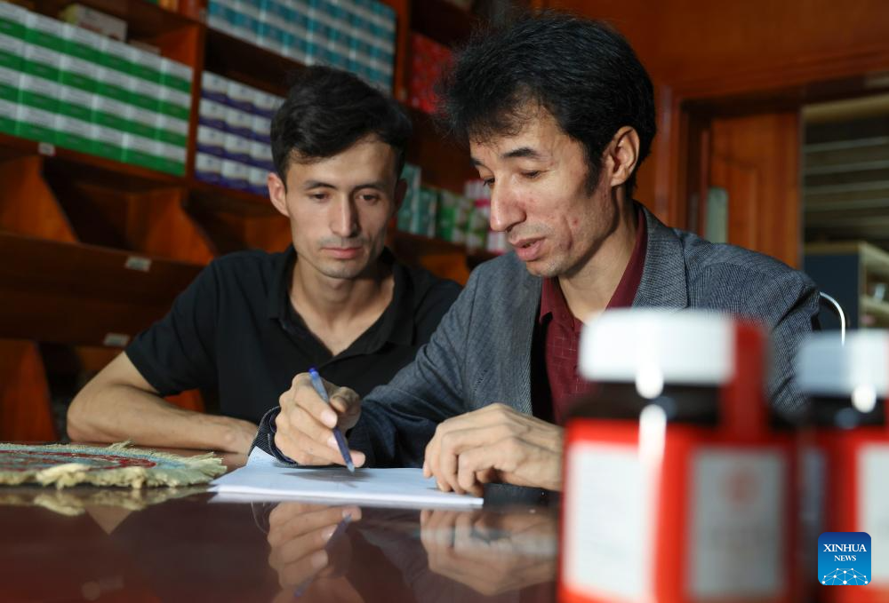 Metkasim Manglik (R) and his nephew check herbal materials at a herbal shop which will soon be opened in Qira County, northwest China's Xinjiang Uygur Autonomous Region, Sept. 6, 2025. (Xinhua/Wang Fei)