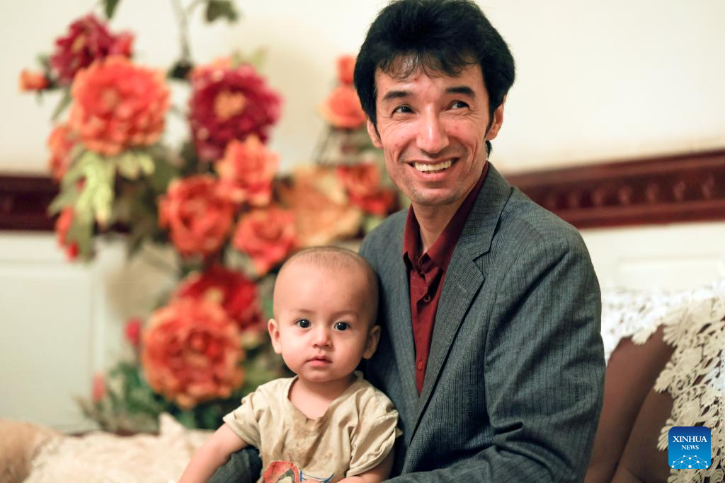 Metkasim Manglik holding his son poses for a photo at home in Qira County, northwest China's Xinjiang Uygur Autonomous Region, Sept. 5, 2025. (Xinhua/Wang Fei)