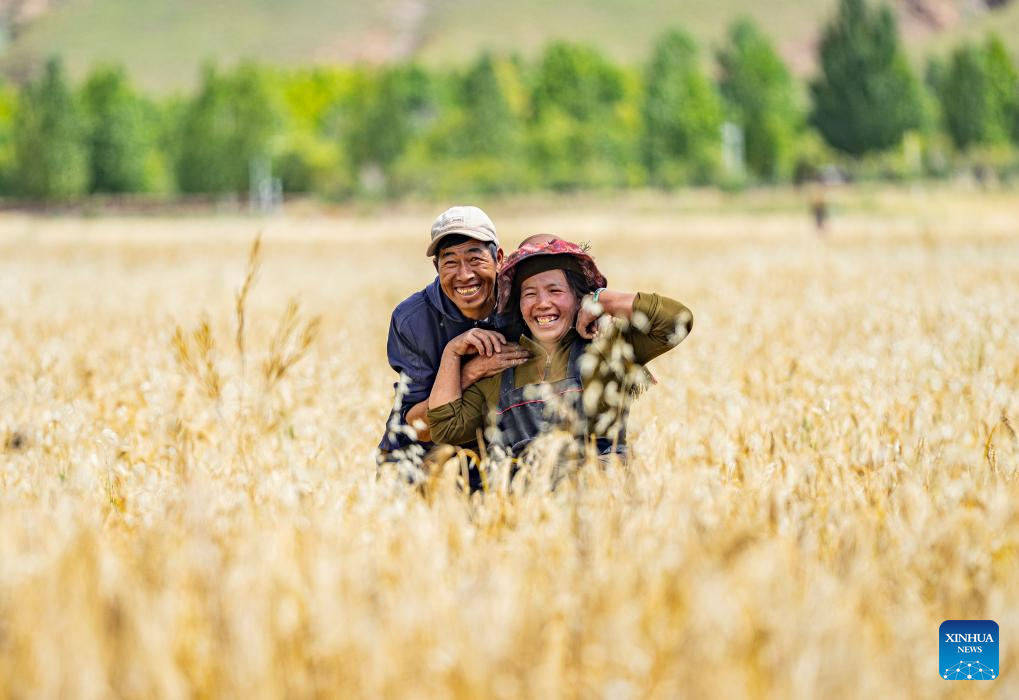 Farmers are seen in a highland barley field in Lhunzhub County, in Lhasa, southwest China's Xizang Autonomous Region, Sept. 23, 2025. The Chinese farmers' harvest festival is the first national festival created specifically for the country's farmers. Starting in 2018, the festival coincides with the Autumnal Equinox each year, which is one of the 24 solar terms of the Chinese lunisolar calendar and usually falls between Sept. 22 and 24 during the country's agricultural harvest season. (Xinhua/Tenzin Nyida)