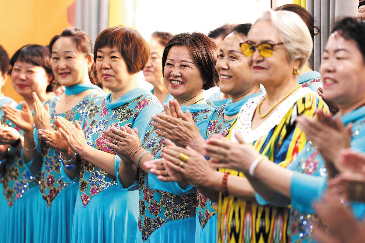 Members of a senior choir called "Starlight" at the Guyuan Lane community in Tianshan district of the Urumqi city, applaud in celebration on Sept 8. ZHU XINGXIN/CHINA DAILY