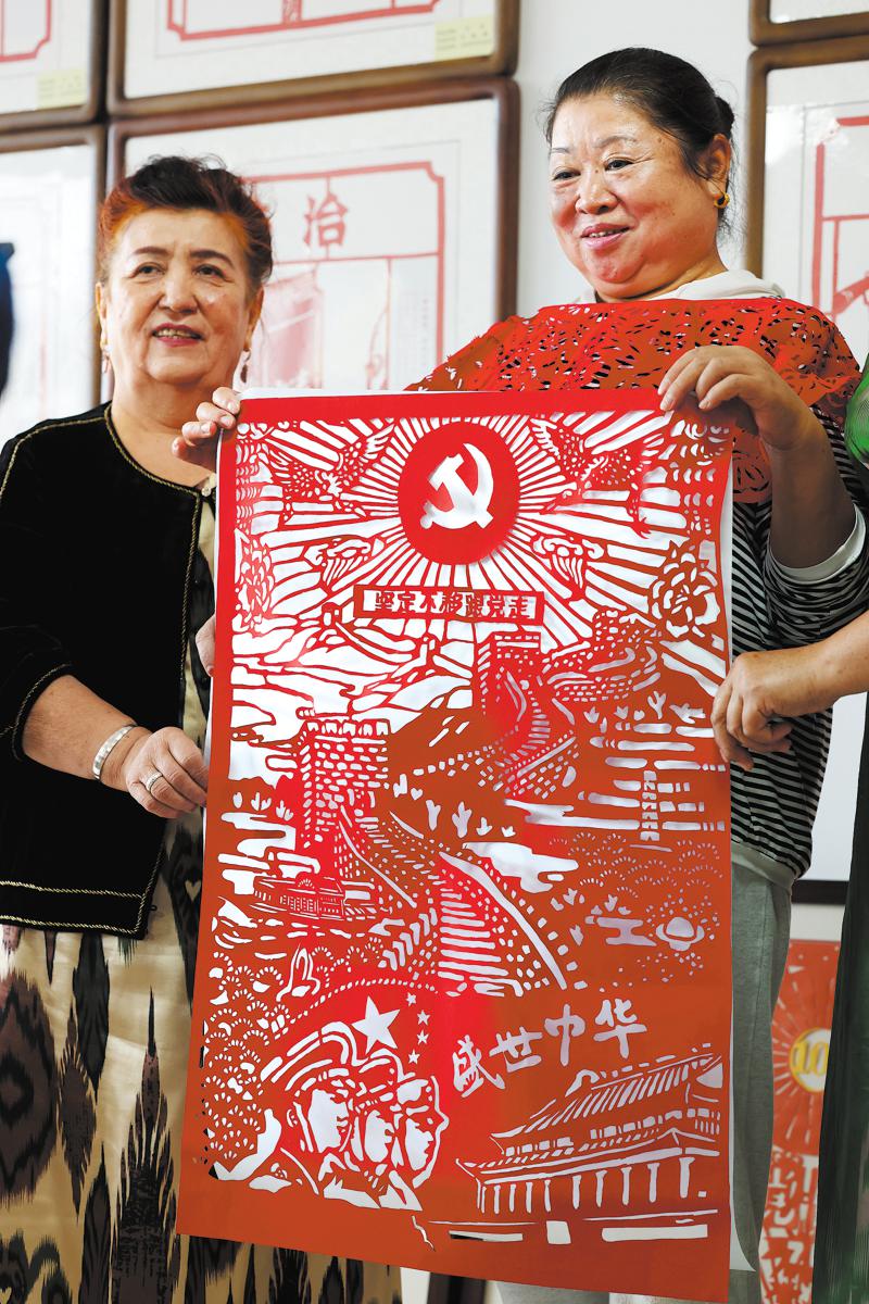 Residents display their paper-cutting artwork at a local community in Karamay district, Karamay city, on Sept 13. ZHU XINGXIN/CHINA DAILY