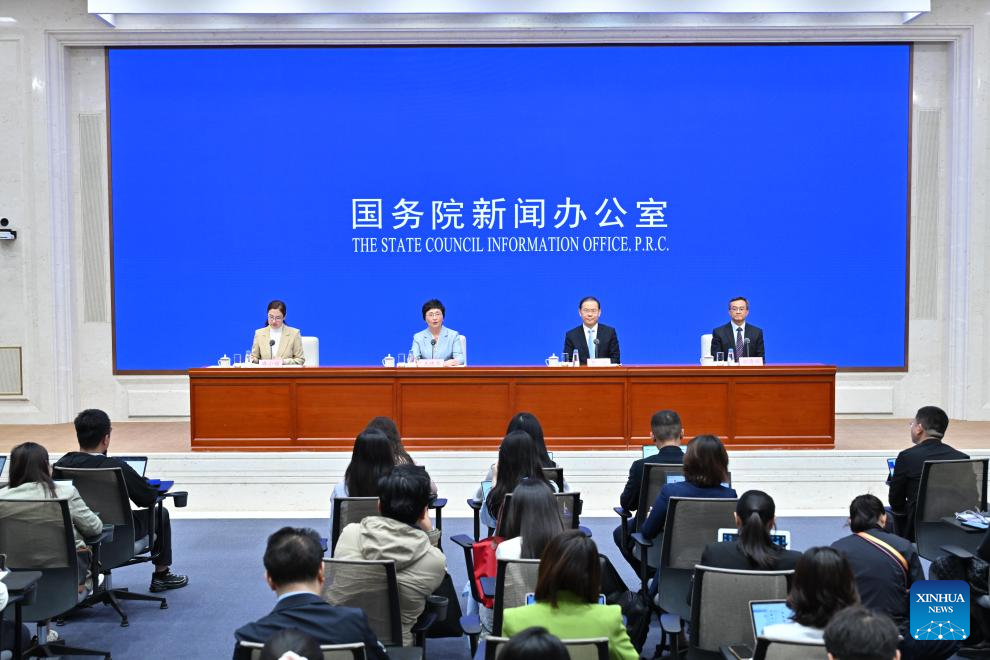 Wang Xiaoping, China's minister of human resources and social security, and Li Zhong and Yan Qinghui, both vice ministers of human resources and social security, attend a press conference held by the State Council Information Office (SCIO) on achievements in high-quality development of employment and social security in the 14th Five-Year Plan period (2021-2025) in Beijing, capital of China, Sept. 26, 2025. (Xinhua/Li Xin)