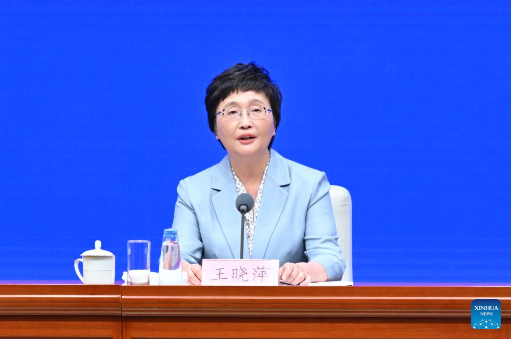 Wang Xiaoping, China's minister of human resources and social security, speaks during a press conference held by the State Council Information Office (SCIO) on achievements in high-quality development of employment and social security in the 14th Five-Year Plan period (2021-2025) in Beijing, capital of China, Sept. 26, 2025. Li Zhong and Yan Qinghui, both vice ministers of human resources and social security, also attended the press conference here on Friday. (Xinhua/Li Xin)