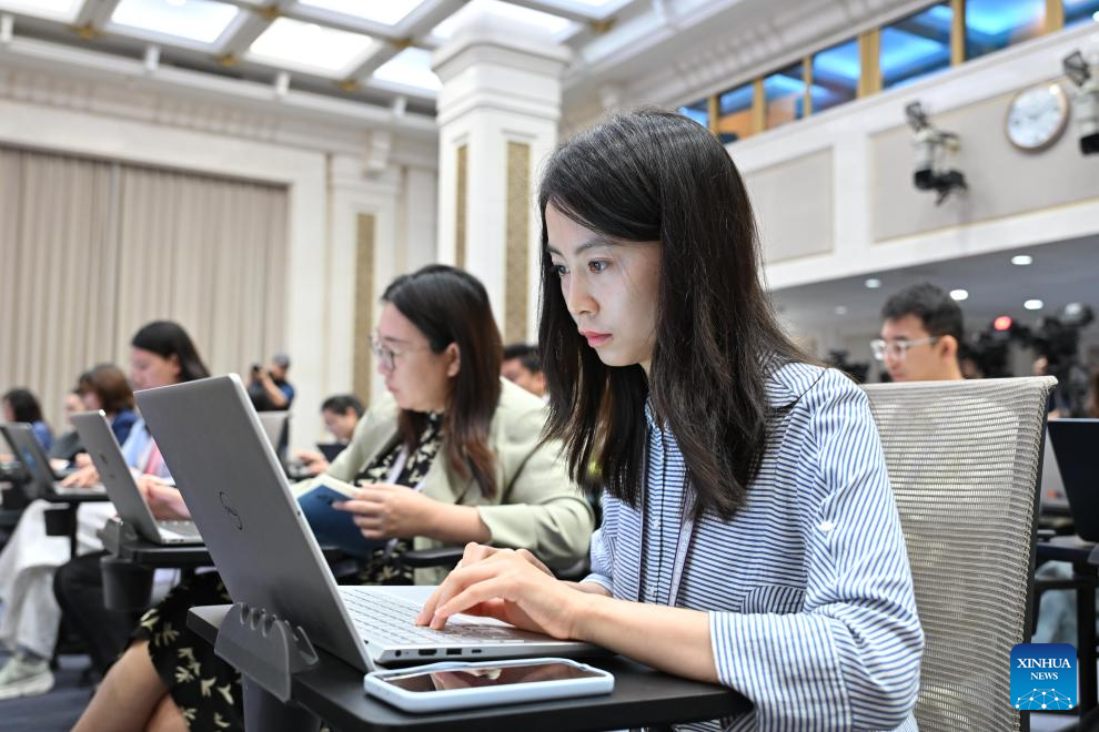 Journalists work at a press conference held by the State Council Information Office (SCIO) on achievements in high-quality development of employment and social security in the 14th Five-Year Plan period (2021-2025) in Beijing, capital of China, Sept. 26, 2025. Wang Xiaoping, China's minister of human resources and social security, and Li Zhong and Yan Qinghui, both vice ministers of human resources and social security, attended the press conference here on Friday. (Xinhua/Li Xin)
