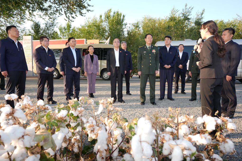 Liu Zhenli and members of a central delegation visit Shihezi City administered by the Xinjiang Production and Construction Corps, northwest China's Xinjiang Uygur Autonomous Region, Sept. 26, 2025. Entrusted by Xi Jinping, general secretary of the Communist Party of China Central Committee, members of a central delegation on Friday continued to visit local officials and residents in multiple areas of northwest China's Xinjiang Uygur Autonomous Region and the Xinjiang Production and Construction Corps (XPCC). (Xinhua/Wang Peng)