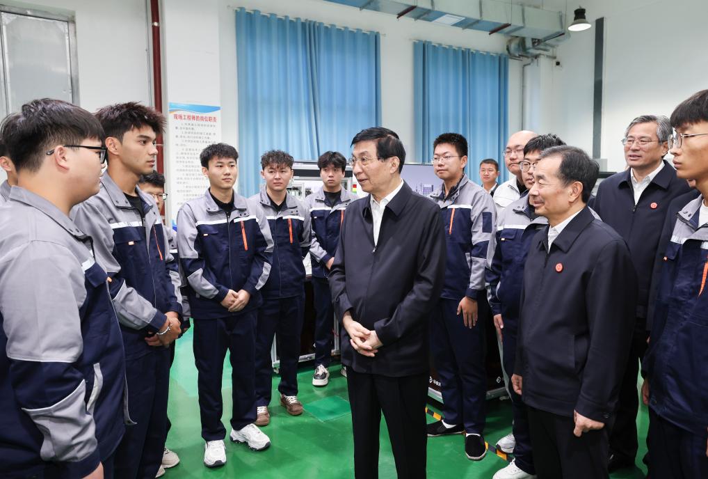 Wang Huning and members of a central delegation visit a vocational school of Xinjiang Production and Construction Corps (XPCC) in northwest China's Xinjiang Uygur Autonomous Region, Sept. 26, 2025. Entrusted by Xi Jinping, general secretary of the Communist Party of China Central Committee, Wang Huning, a member of the Standing Committee of the Political Bureau of the Communist Party of China Central Committee, chairman of the National Committee of the Chinese People's Political Consultative Conference, and head of the central delegation, led a group of delegation members to the XPCC-administered cities of Tiemenguan and Beitun. (Xinhua/Yao Dawei)