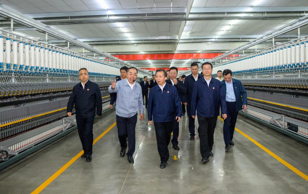 Li Ganjie and members of a central delegation visit a textile company in northwest China's Xinjiang Uygur Autonomous Region, Sept. 26, 2025. Entrusted by Xi Jinping, general secretary of the Communist Party of China Central Committee, members of a central delegation on Friday continued to visit local officials and residents in multiple areas of northwest China's Xinjiang Uygur Autonomous Region and the Xinjiang Production and Construction Corps (XPCC). (Xinhua/Jin Liangkuai)