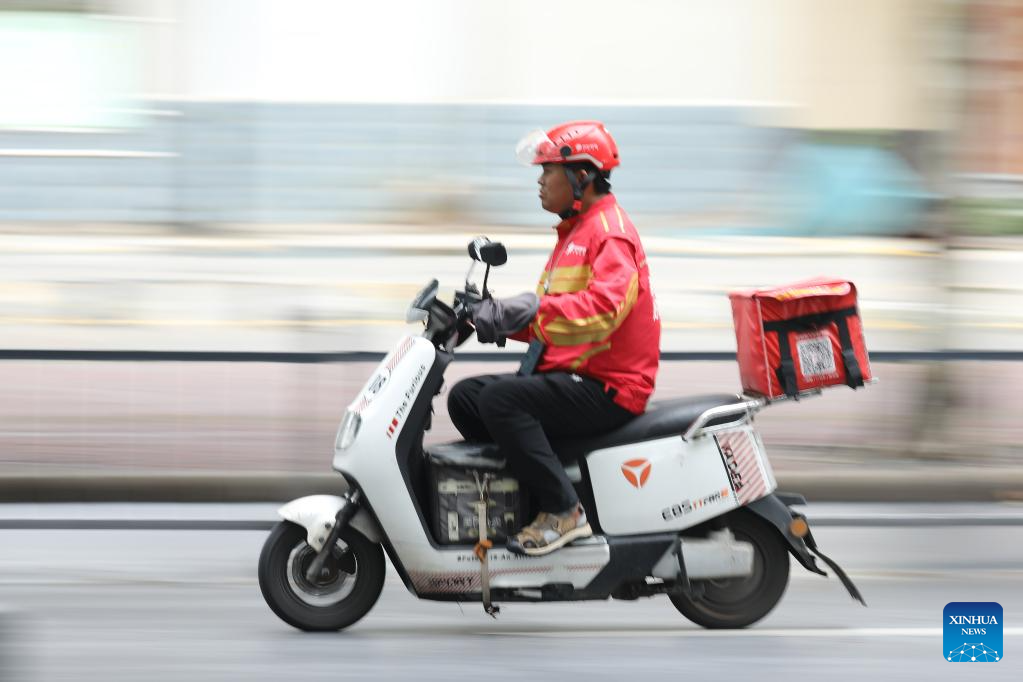 A food deliveryman rides on the street in Wenxian County, Jiaozuo, central China's Henan Province, Oct. 2, 2025. Workers from all walks of life have been standing fast at their posts and fulfilling their duties with full dedication during the eight-day National Day and Mid-Autumn Festival holiday. (Photo by Xu Hongxing/Xinhua)
