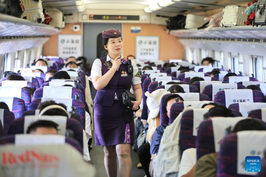 A train attendant works on a train in east China's Jiangsu Province, Oct. 1, 2025. Workers from all walks of life have been standing fast at their posts and fulfilling their duties with full dedication during the eight-day National Day and Mid-Autumn Festival holiday. (Photo by Su Yang/Xinhua)