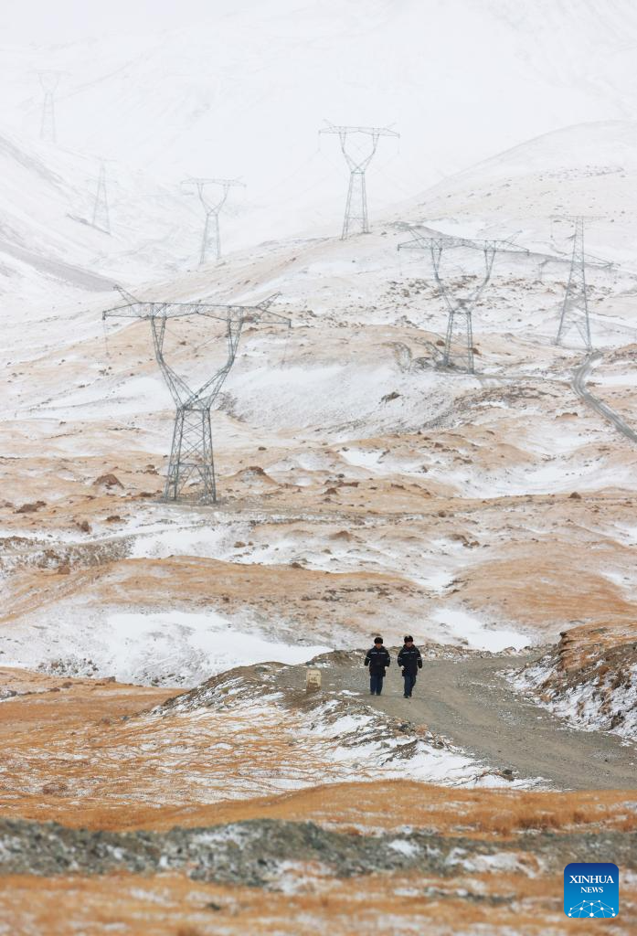 Staff members of a power company patrol along a 750-kilovolt (kV) power transmission line in Hejing County of Mongolian Autonomous Prefecture of Bayingolin, northwest China's Xinjiang Uygur Autonomous Region, Oct. 2, 2025. Workers from all walks of life have been standing fast at their posts and fulfilling their duties with full dedication during the eight-day National Day and Mid-Autumn Festival holiday. (Photo by Zhang Limin/Xinhua)