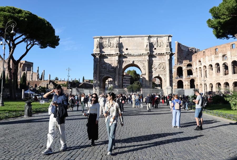 Chinese tourists visit the center of Rome, Italy, Oct. 6, 2025. (Xinhua/Li Jing)