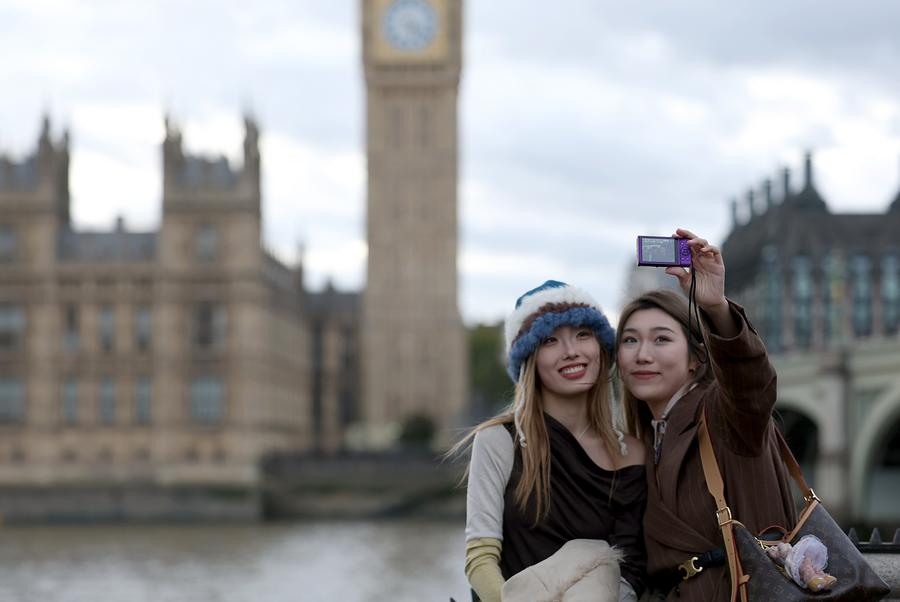 Two Chinese tourists take a selfie near the Big Ben in London, Britain, Oct. 5, 2025. (Xinhua/Li Ying)