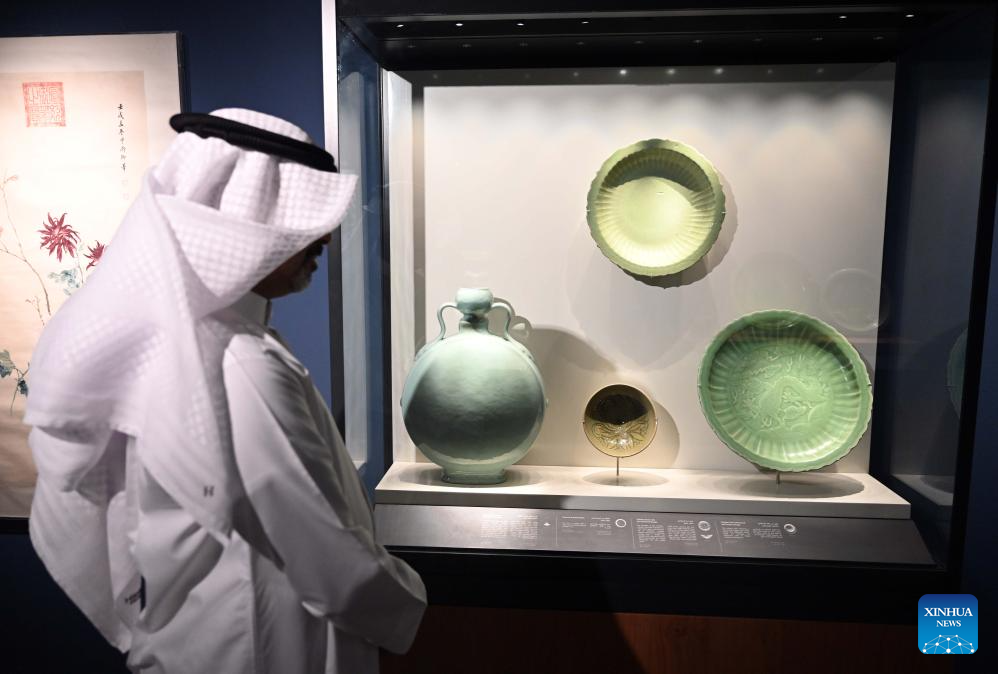 People visit the exhibition in Kuwait City, Kuwait, Oct. 15, 2025. The Chinese art exhibition "Distant and Close" opened on Wednesday at Kuwait's Dar al-Athar al-Islamiyyah, or House of Islamic Antiquities, a major public museum in Kuwait City. The exhibition, running through 2026, showcases the historical and cultural ties between China and Kuwait. (Photo by Asad/Xinhua)