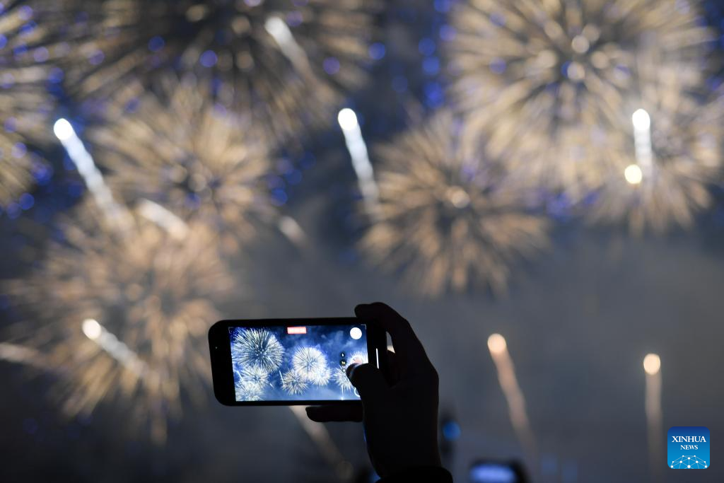 A tourist shoots a video during a firework show in Liuyang City, central China's Hunan Province, Oct. 24, 2025. The opening ceremony of the 17th Liuyang Fireworks Cultural Festival was held here on Friday. Liuyang is well-known for its fireworks industry. (Xinhua/Chen Zhenhai)