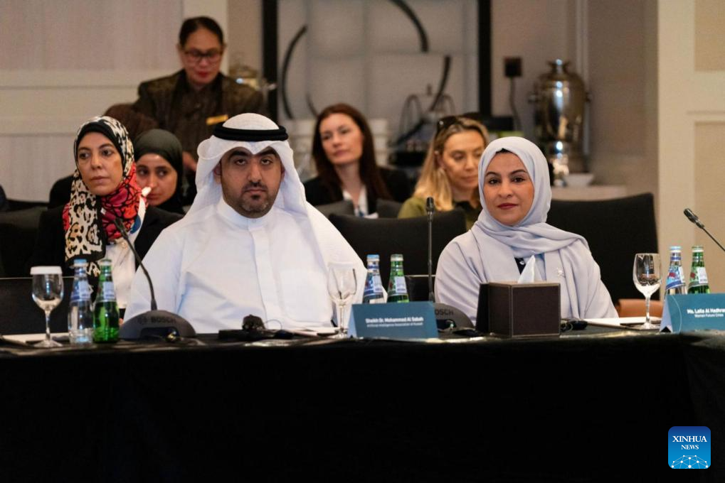 Sheikh Mohammed Al-Sabah (L), chairman of Kuwait's Association of Artificial Intelligence of Things (AAIOT), a government agency promoting AI and Intelligence of Things (IOT) awareness, research, and adoption, attends an event in Doha, Qatar, April 24, 2025. (Xinhua)