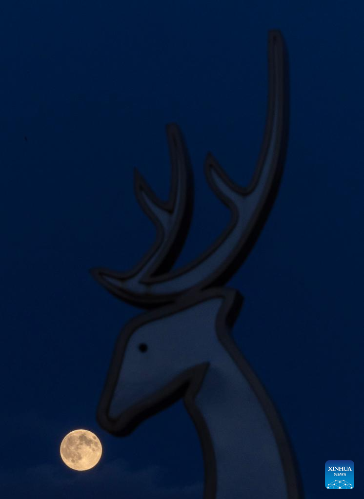 A drone photo taken on Nov. 5, 2025 shows a full moon on the sky over a neon sign in Nantong, east China's Jiangsu Province, on Nov. 5, 2025. Lunar observers will be able to see the largest and brightest full moon of 2025 when the moon reaches its closest point to Earth at 9:19 p.m. Beijing Time on Wednesday. (Photo by Xu Congjun/Xinhua)