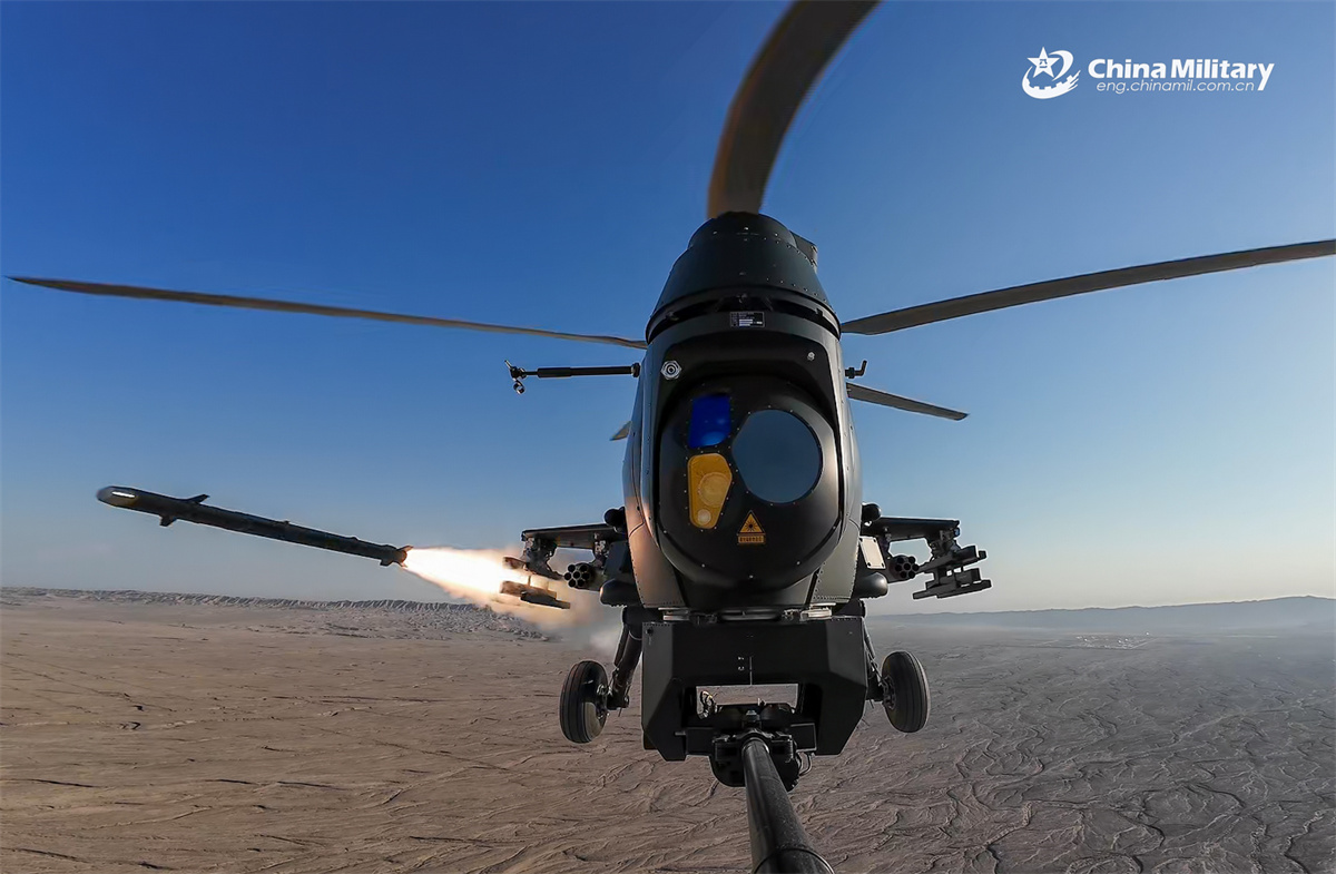 A Z-10 attack helicopter attached to a brigade under the Chinese PLA Xinjiang Military Command launches missile at the target during a live-fire training exercise on October 18, 2025. (eng.chinamil.com.cn/Photo by Ji Jiantao)