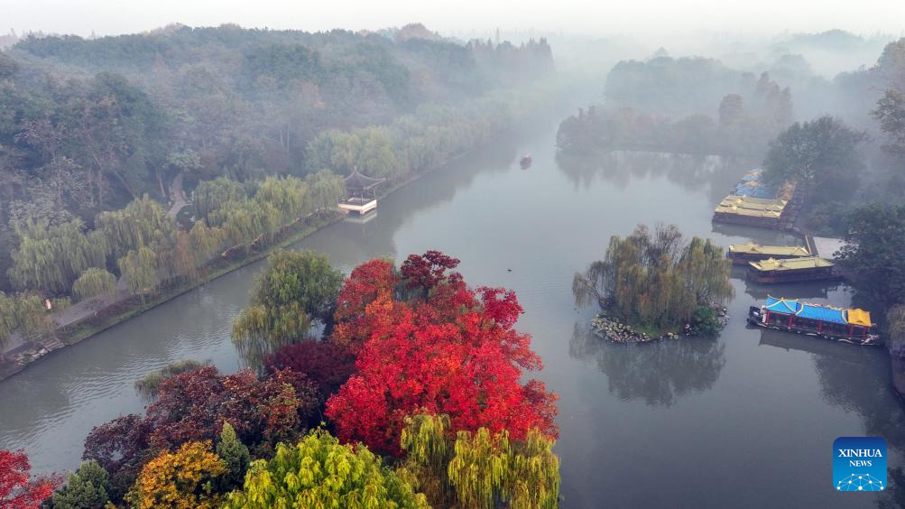 An aerial drone photo taken on Nov. 14, 2025 shows a view of the Slender West Lake scenic spot amid morning mist in Yangzhou, east China's Jiangsu Province. (Photo by Qi Liguang/Xinhua)