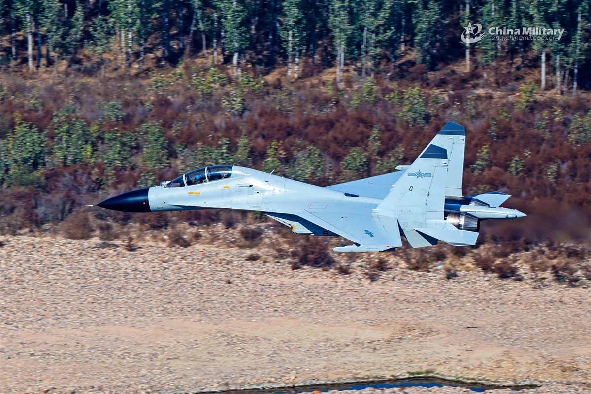 A J-11BS fighter jet attached to a regiment under the Chinese PLA Naval Aviation University flies through a canyon at ultra-low altitude during a combat training exercise. (eng.chinamil.com.cn/Photo by Ping Haonan)