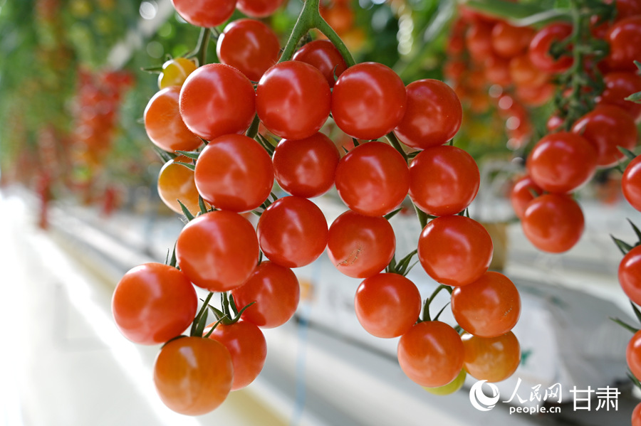 Photo shows cherry tomatoes at a smart agricultural industrial park in Ganzhou district of Zhangye city, northwest China's Gansu Province. (People's Daily Online/Xi Juanjuan)