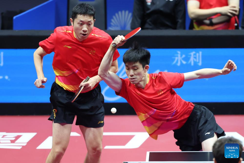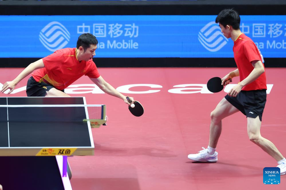 Xu Xin (L)/Zhou Kai of Shanghai compete against Zhou Yu/Liang Yanning of Hebei during the men's team quarterfinal match of table tennis between Shanghai and Hebei at China's 15th National Games in Macao, south China, Nov. 18, 2025. (Xinhua/Liu Xu)
