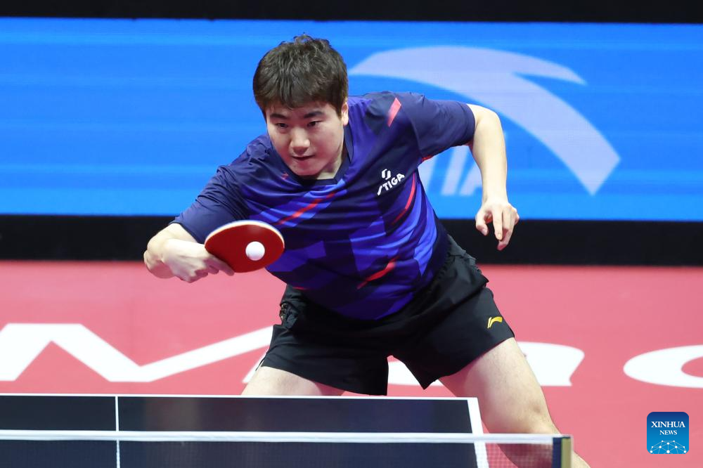 Liang Jingkun of Hebei hits a return in the match against Fan Zhendong of Shanghai during the men's team quarterfinal match of table tennis between Shanghai and Hebei at China's 15th National Games in Macao, south China, Nov. 18, 2025. (Xinhua/Liu Xu)