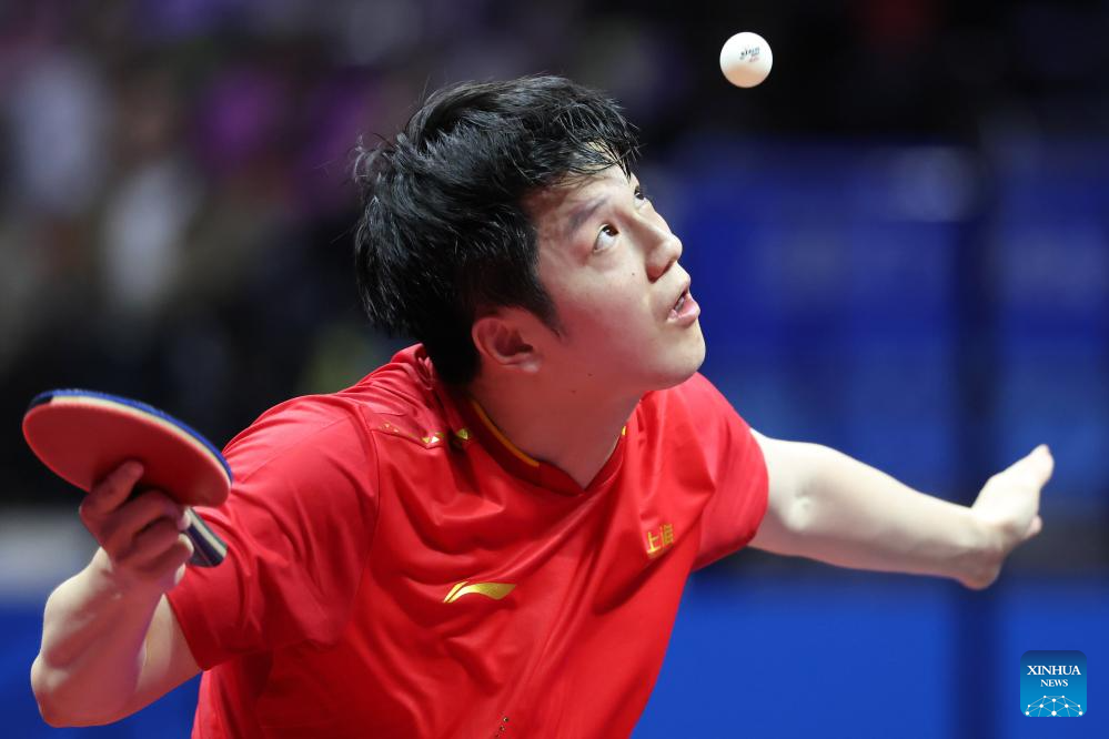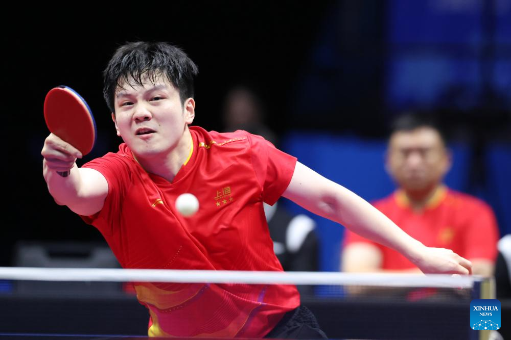 Fan Zhendong of Shanghai hits a return in the match against Liang Jingkun of Hebei during the men's team quarterfinal match of table tennis between Shanghai and Hebei at China's 15th National Games in Macao, south China, Nov. 18, 2025. (Xinhua/Liu Xu)