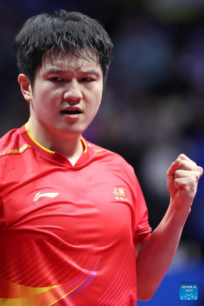 Fan Zhendong of Shanghai celebrates scoring in the match against Liang Jingkun of Hebei during the men's team quarterfinal match of table tennis between Shanghai and Hebei at China's 15th National Games in Macao, south China, Nov. 18, 2025. (Xinhua/Liu Xu)