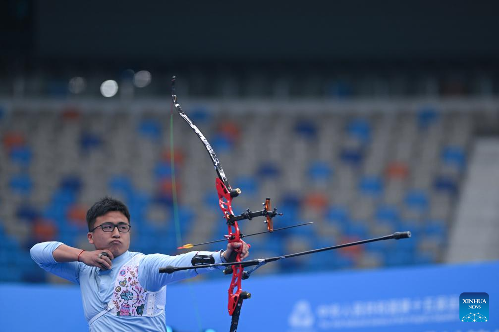 Sun Quan of Shandong competes during the men's recurve team final of archery at China's 15th National Games in Shenzhen, south China's Guangdong Province, Nov. 19, 2025. (Xinhua/Zhang Long)