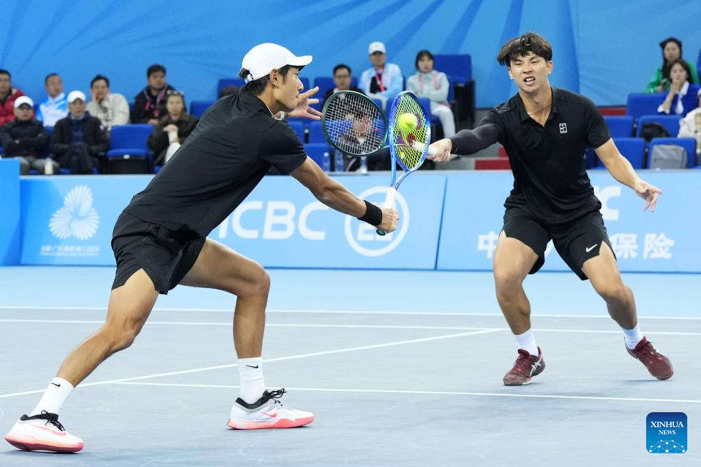 Tang Sheng/Sun Qian (L) are seen during the tennis men's doubles final between Tang Sheng/Sun Qian of Jiangsu and Bu Yunchaokete/Zheng Zhan of Zhejiang at China's 15th National Games in Hengqin, south China's Guangdong Province, Nov. 19, 2025. (Xinhua/Yan Linyun)