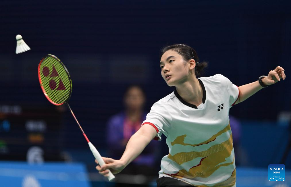 Gao Fangjie hits a return during the women's singles bronze medal match of badminton between Han Yue of Fujian and Gao Fangjie of Jiangsu at China's 15th National Games in Shenzhen, south China's Guangdong Province, Nov. 19, 2025. (Xinhua/Li Ziheng)