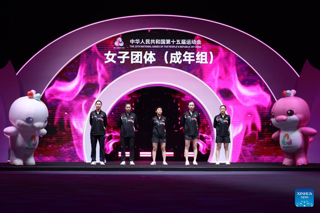 Athletes of team Shandong are seen before the women's team final of table tennis between Hebei and Shandong at China's 15th National Games in Macao, south China, Nov. 19, 2025. (Xinhua/Liang Xu)