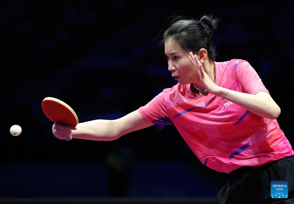Sun Yingsha of Hebei hits a return in the match against Wang Xiaotong of Shandong during the fourth match of women's team final of table tennis between Hebei and Shandong at China's 15th National Games in Macao, south China, Nov. 19, 2025. (Xinhua/Liang Xu)