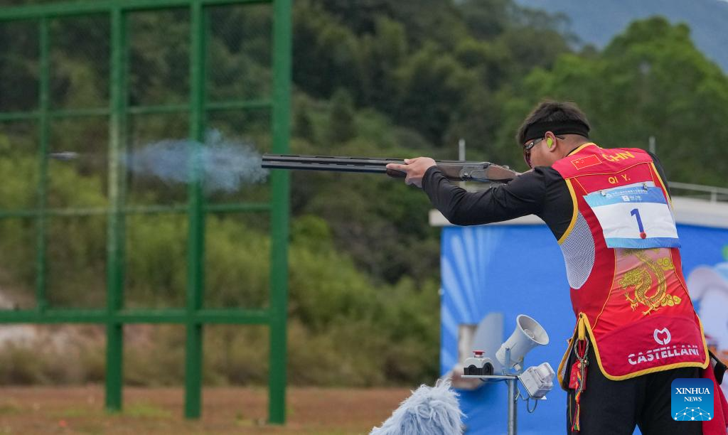 Qi Ying of Shandong competes during the trap men's final of shooting at China's 15th National Games in Guangzhou, south China's Guangdong Province, Nov. 19, 2025. (Xinhua/Xiao Ennan)