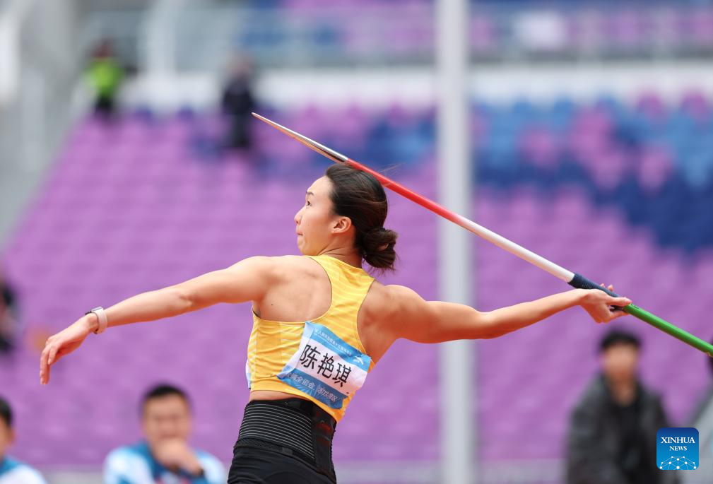 Zheng Ninali of Shanxi competes during the women's heptathlon javelin throw of athletics at China's 15th National Games in Guangzhou, south China's Guangdong Province, Nov. 19, 2025. (Xinhua/Jiang Han)