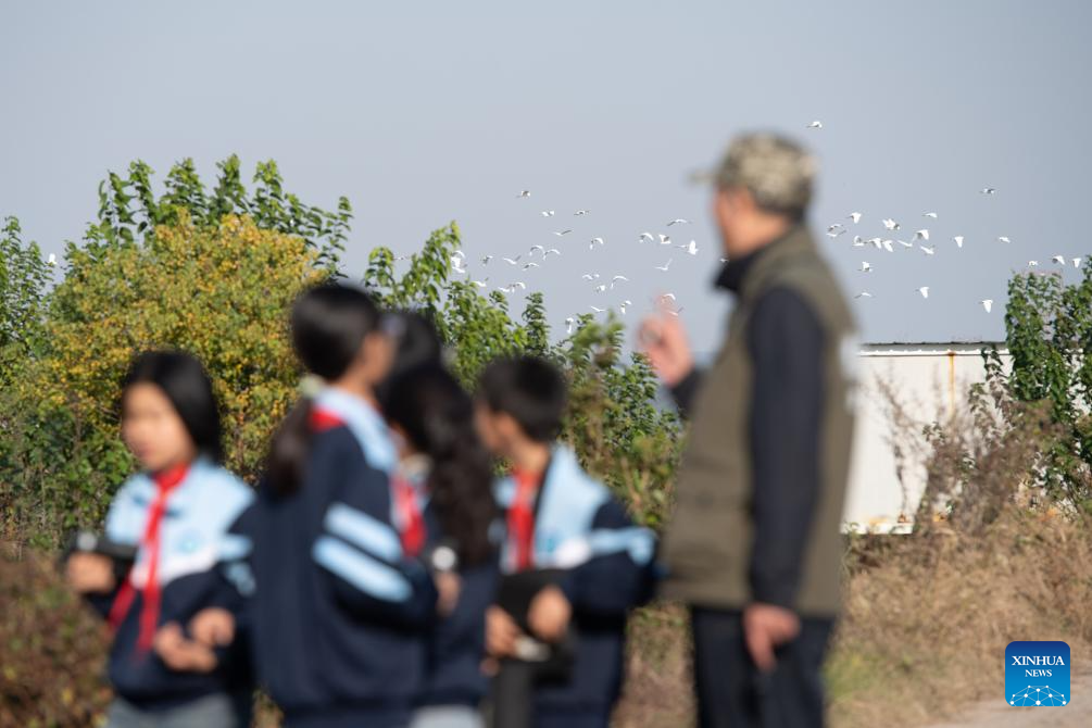 A flock of egrets flies behind as students of Maotan Primary School observe birds under the guidance of a wild bird conservation volunteer at the Shibasuo provincial nature reserve in Chizhou City, east China's Anhui Province, Nov. 18, 2025. (Xinhua/Zhang Duan)