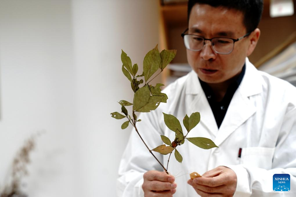 Ge Binjie, curator of the Shanghai Chenshan Herbarium, arranges newly-collected specimens at the National Wild Plant Germplasm Resource Center for Shanghai Chenshan Botanical Garden in Shanghai, east China, Nov. 19, 2025. (Xinhua/Zhang Jiansong)