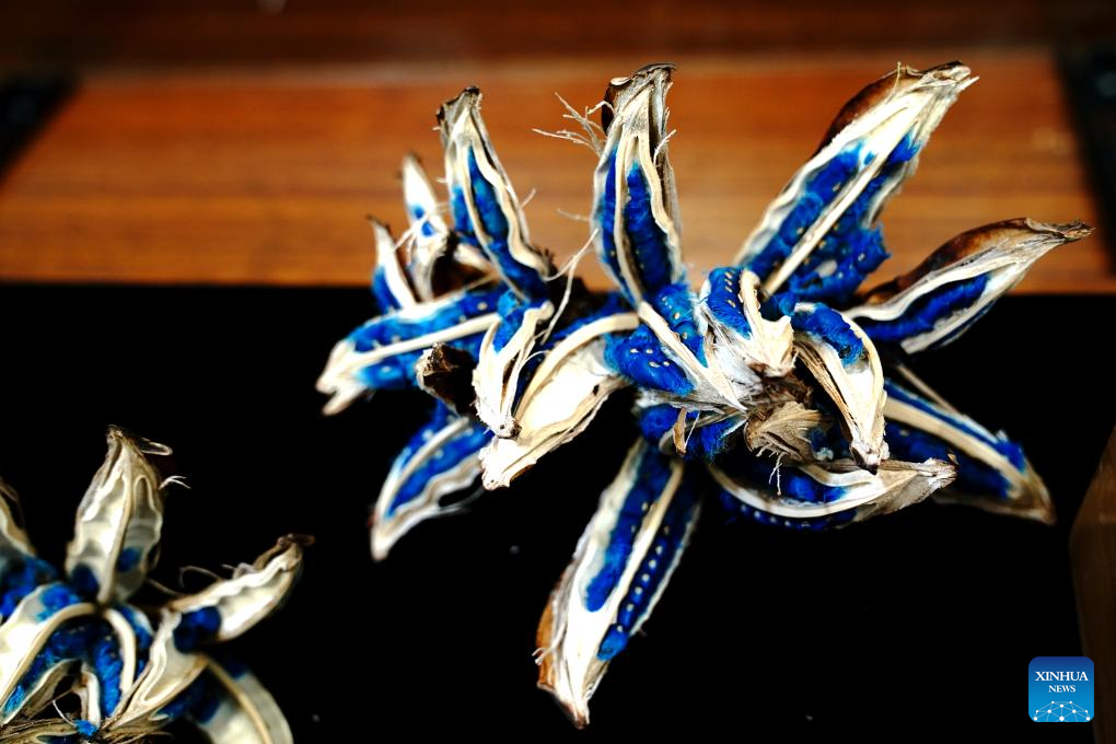 This photo shows a blue seed of Ravenala madagascariensis at the National Wild Plant Germplasm Resource Center for Shanghai Chenshan Botanical Garden in Shanghai, east China, Nov. 19, 2025. (Xinhua/Zhang Jiansong)