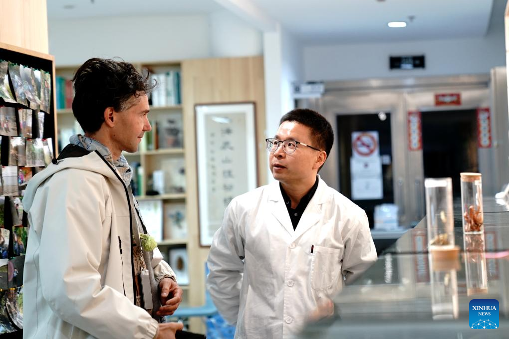 Ge Binjie (R), curator of the Shanghai Chenshan Herbarium, introduces knowledge of seeds to a foreign artist at the herbarium in Shanghai, east China, Nov. 19, 2025. (Xinhua/Zhang Jiansong)