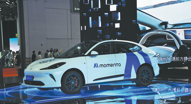 A car is showcased at the demonstration area of Chinese autonomous driving startup Momenta during an auto expo in Shanghai on May 2. CHINA DAILY