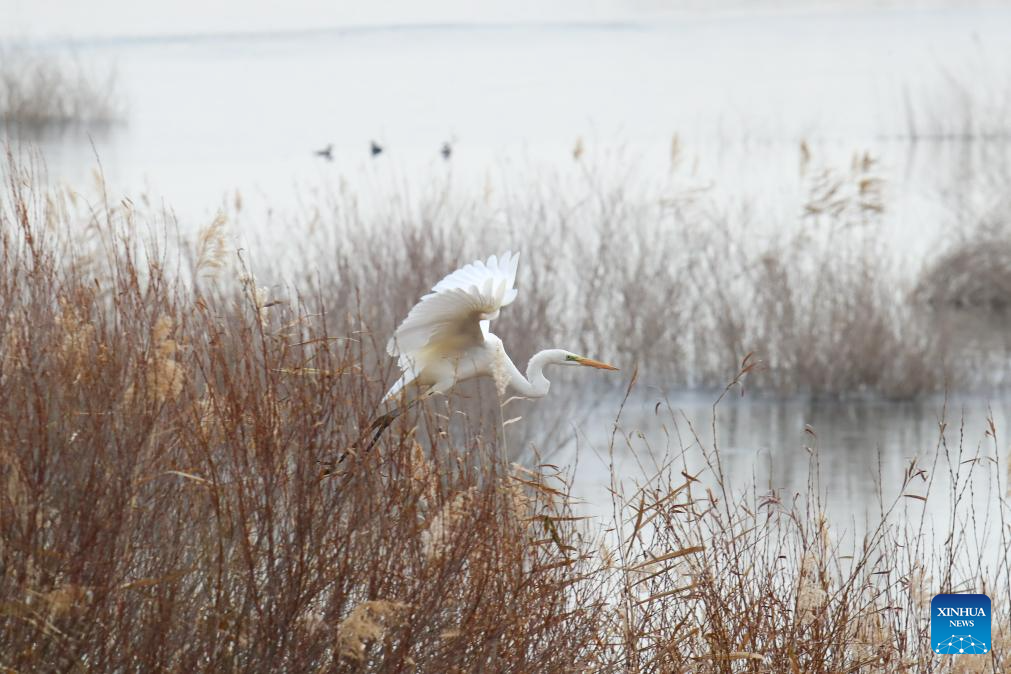 This photo taken on Nov. 22, 2025 shows a great egret at a reservoir in Shiyanghe River National Wetland Park in Minqin County of Wuwei City, northwest China's Gansu Province. The Hexi Corridor, spanning nearly 1,000 km in China's Gansu Province, is interspersed with oases, rivers, lakes, wetlands, and artificial reservoirs, providing favorable habitats and abundant food resources for migratory birds. (Xinhua/Zhang Zhimin)