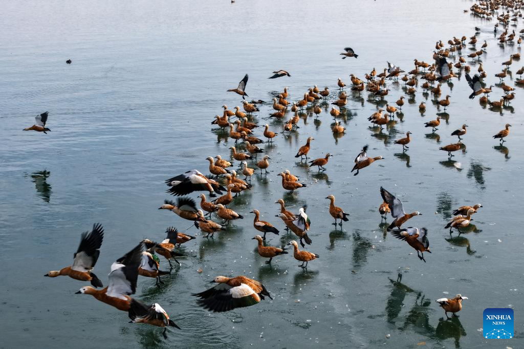 This photo taken on Nov. 22, 2025 shows ruddy shelducks at a reservoir in Shiyanghe River National Wetland Park in Minqin County of Wuwei City, northwest China's Gansu Province. The Hexi Corridor, spanning nearly 1,000 km in China's Gansu Province, is interspersed with oases, rivers, lakes, wetlands, and artificial reservoirs, providing favorable habitats and abundant food resources for migratory birds. (Xinhua/Zhang Zhimin)