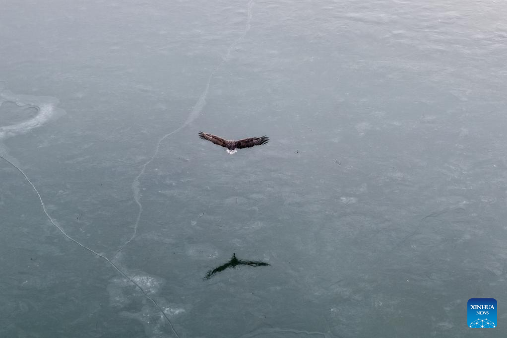 An aerial drone photo taken on Nov. 22, 2025 shows a white-tailed sea eagle at a reservoir in Shiyanghe River National Wetland Park in Minqin County of Wuwei City, northwest China's Gansu Province. The Hexi Corridor, spanning nearly 1,000 km in China's Gansu Province, is interspersed with oases, rivers, lakes, wetlands, and artificial reservoirs, providing favorable habitats and abundant food resources for migratory birds. (Xinhua/Lang Bingbing)