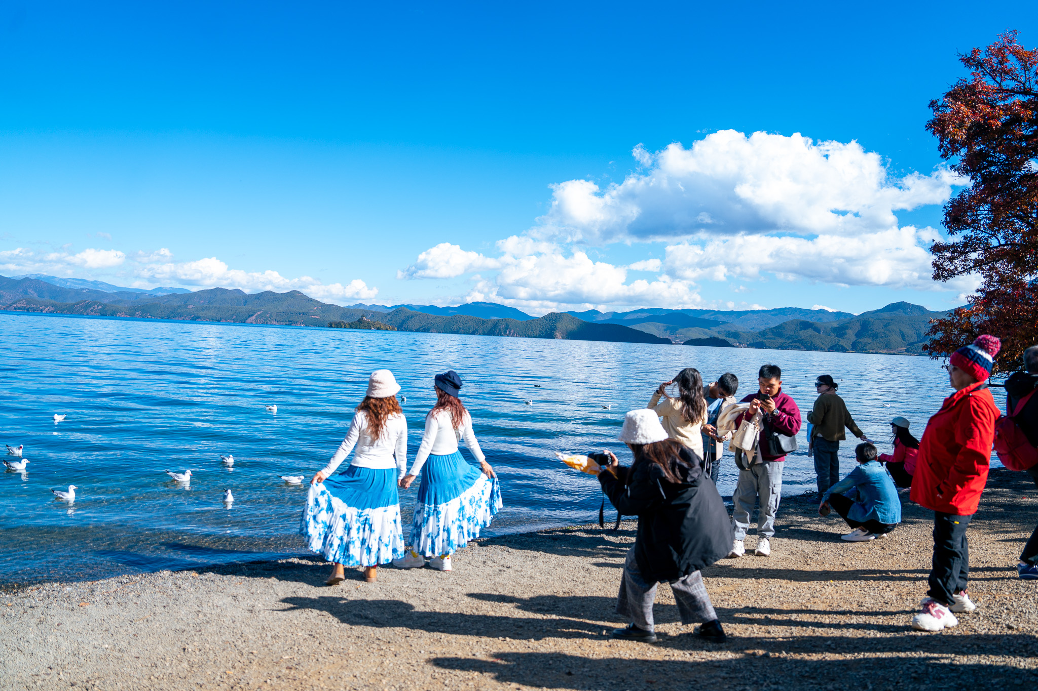 Photo shows tourists on the bank of Lugu Lake in Ninglang Yi Autonomous County, Lijiang city, southwest China's Yunnan Province. (Photo courtesy of the Publicity Department of the Communist Party of China Lijiang Municipal Committee)