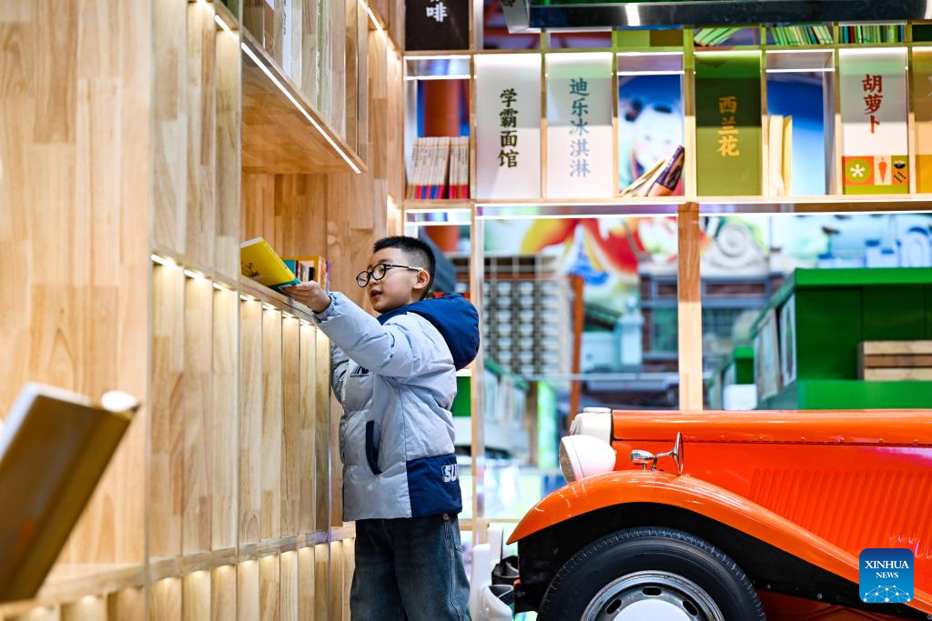 A boy is pictured at a reading room at Sanshui grocery market in Hexi District of Tianjin, north China, Nov. 25, 2025. (Xinhua/Zhao Zishuo)