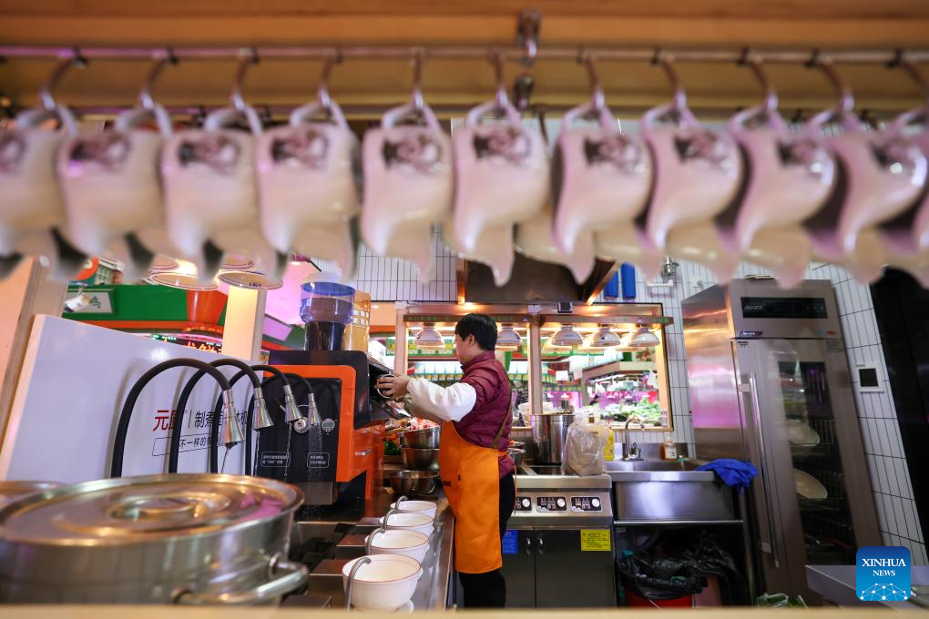A stall owner prepares food at Sanshui grocery market in Hexi District of Tianjin, north China, Nov. 25, 2025. (Xinhua/Sun Fanyue)