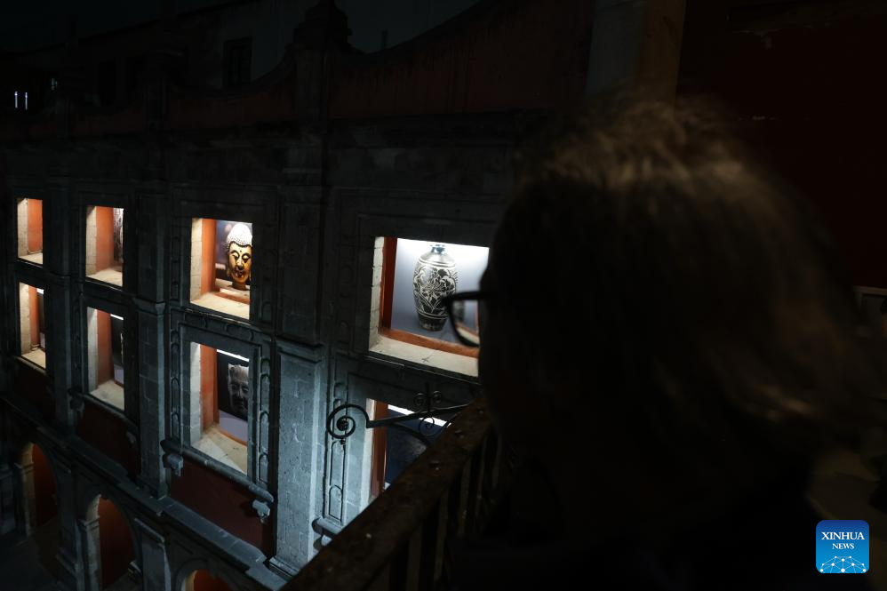 A visitor looks at exhibits at a photo exhibition of the Xixia Imperial Tombs in Mexico City, Mexico, Nov. 26, 2025. The exhibition "Xixia Imperial Tombs -- An Enduring World Cultural Heritage" was held on Wednesday in Mexico City. The exhibition combines photographs and a light show to present the historical significance and cultural richness of the Xixia Imperial Tombs, offering local audiences a visual introduction to this UNESCO World Heritage site. (Xinhua/Francisco Canedo)