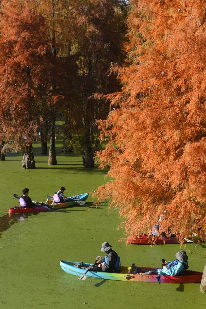 Tourists paddle through a waterlogged forest in the Qingshan Lake scenic spot in Lin'an District of Hangzhou City, east China's Zhejiang Province, Nov. 28, 2025. (Xinhua/Weng Xinyang)